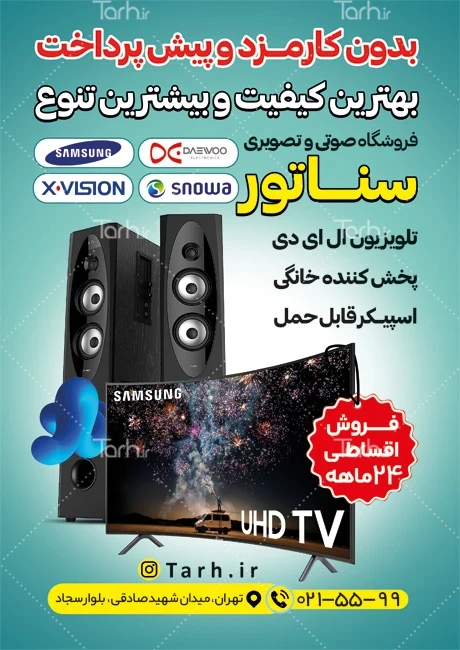 فایل تراکت فروش لوازم صوتی و تصویری با فرمت psd و قابل ویرایش در نرمافزار فتوشاپ بهصورت لایه باز توسط تیم طراحان طرح دات آی آر طراحی شده است. در نمونه تراکت لوازم صوتی تصویری از تصاویر و المانهای باکیفیت و متناسب با استاندارد چاپ استفادهشده، همچنین نکات مهم در طرح تراکت لوازم صوتی تصویری مانند رنگبندی، رعایت حاشیه، فاصلهها، فضای کافی برای درج متن، سایز و نوع فونت مناسب طراحی تراکت و ... رعایت گردیده است. طرح لایه باز تراکت فروش لوازم صوتی و تصویری شامل عکس تلویزیون و اسپیکر میباشد که المانهای استفادهشده در طرح تراکت فروش لوازم صوتی و تصویری قابلیت ویرایش، جابهجایی و تغییر سایز را دارا بوده و شما میتوانید متناسب باسلیقه خودتان تراکت لایه باز لوازم صوتی و تصویری را ویرایش نمایید، همچنین با تغییر تصاویر و متنها میتوانید طرح تراکت فروشگاه تجهیزات صوتی و تصویری را به طرح تراکت کسب و کار مد نظر خود شخصی سازی نمایید.