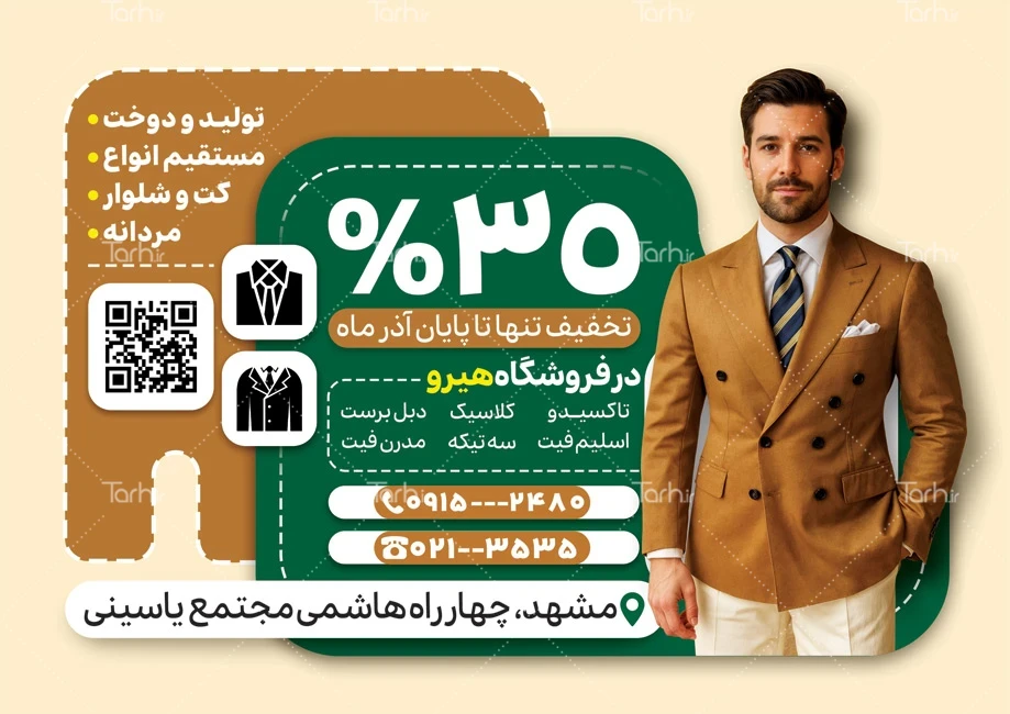 طرح psd تراکت فروشگاه کت شلوار با فرمت psd و قابل ویرایش در نرمافزار فتوشاپ بهصورت لایه باز توسط تیم طراحان طرح دات آی آر طراحی شده است. در نمونه پوستر تبلیغاتی کت و شلوار از تصاویر و المانهای باکیفیت و متناسب با استاندارد چاپ استفادهشده، همچنین نکات مهم در طرح لایه باز تراکت کت و شلوار مانند رنگبندی، رعایت حاشیه، فاصلهها، فضای کافی برای درج متن، سایز و نوع فونت مناسب طراحی تراکت و ... رعایت گردیده است. طرح لایه باز تراکت فروشگاه کت شلوار شامل عکس مرد میباشد که المانهای استفادهشده در طرح تراکت پوشاک مردانه قابلیت ویرایش، جابهجایی و تغییر سایز را دارا بوده و شما میتوانید متناسب باسلیقه خودتان تراکت لایه باز کت شلوار مردانه را ویرایش نمایید، همچنین با تغییر تصاویر و متنها میتوانید طرح تراکت کت شلوار را به طرح تراکت کسب و کار مد نظر خود شخصی سازی نمایید.
