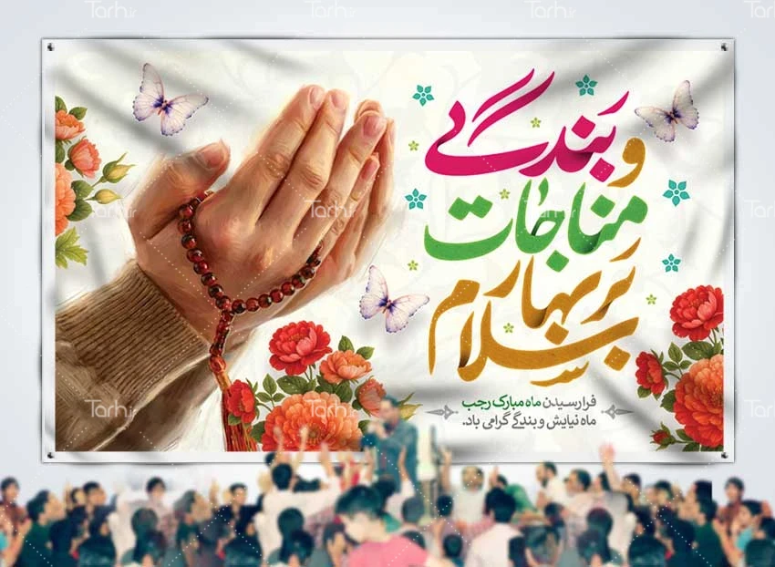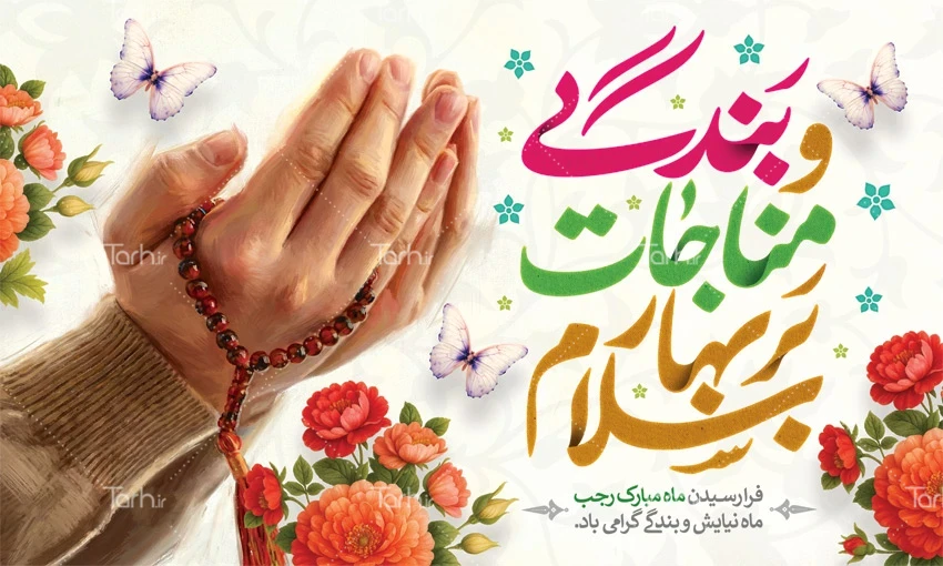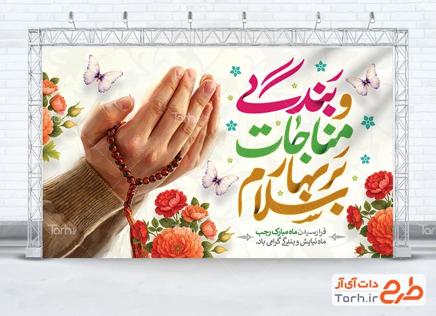 طرح بنر پشت سن تبریک ماه رجب با تایپوگرافی سلام بر بهار مناجات و بندگی کد فایل 8279350