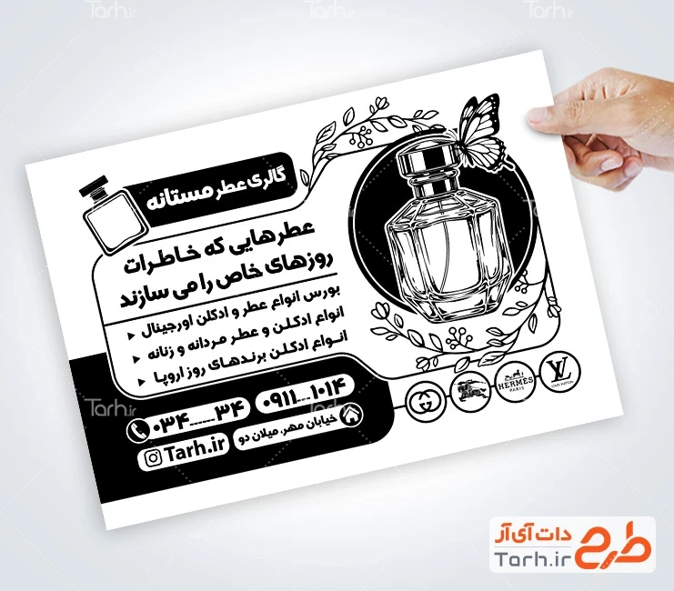 ابعاد تراکت تبلیغاتی سیاه و سفید عطر و ادکلن در جدول ویژگیهای فایل درجشده و با توجه به لایه باز بودن و کیفیت بالای طرح تراکت ریسو عطر و ادکلن فروشی، قابلیت ویرایش و تبدیل به سایز دلخواه، همچنین چاپ روی متریالهای مختلف مانند انواع کاغذ، گلاسه، کاغذ الوان و ... را دارا میباشد. همچنین میتوان طرح سیاه سفید عطر فروشی را در زمینه های چاپ سیلک ، نایلون، ساک دستی، پاکت دستی و کیسه نیز استفاده کرد. تراکت های سیاه سفید یا ریسو یک ابزار تبلیغاتی بسیار موثر محسوب می شوند و به دلیل هزینه کم و تأثیر بالا، در بسیاری از کسب و کارها به عنوان روشی اقتصادی و موثر برای انتقال اطلاعات به مخاطبان برای تبلیغات و رویدادهای مختلف استفاده میشوند.