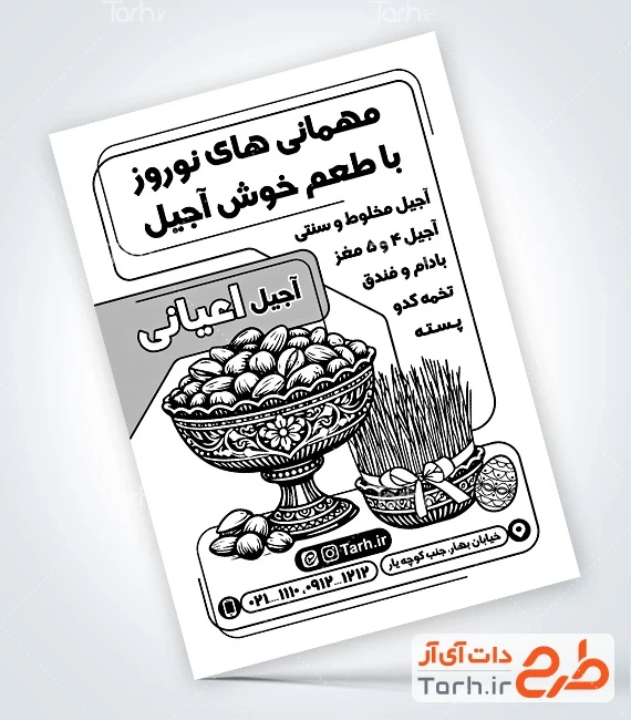ابعاد قابل چاپ طرح تراکت سیاه سفید آجیل و خشکبار فروشی ویژه عید نوروز و کاربرد آن
