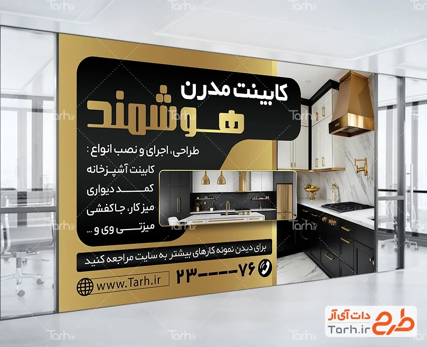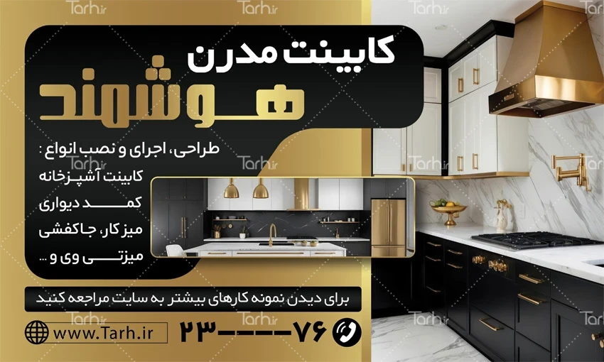 طرح قابل ویرایش بنر ساخت و نصب کابینت آشپزخانه با فرمت psd و قابل ویرایش در نرم افزار فتوشاپ به صورت لایه باز توسط تیم طراحان طرح دات آی آر طراحی شده است. در طرح لایه باز کابینت سازی از تصاویر و المان های با کیفیت و متناسب با استاندارد چاپ استفاده شده، همچنین نکات مهم در تابلو سردر مغازه مانند رنگ بندی، رعایت حاشیه، فاصله ها، سایز و نوع فونت مناسب طراحی تابلو مشاغل و ... رعایت گردیده است. طرح بنر کابینت شامل عکس دکوراسیون آشپزخانه می باشد که المان های استفاده شده در طرح تابلو دکوراسیون داخلی قابلیت ویرایش، جابه جایی و تغییر سایز را دارا بوده و شما می توانید متناسب با سلیقه خودتان طرح بنر تبلیغاتی کابینت را ویرایش نمایید، همچنین با تغییر تصاویر و متن ها می توانید طرح تابلو کابینت سازی را به طرح تابلوی شغل مورد نظر خود تبدیل نمایید.