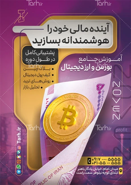 دانلود تراکت تبلیغاتی آموزش بورس دارای عکس سکه بیت کوین کد فایل 8390572