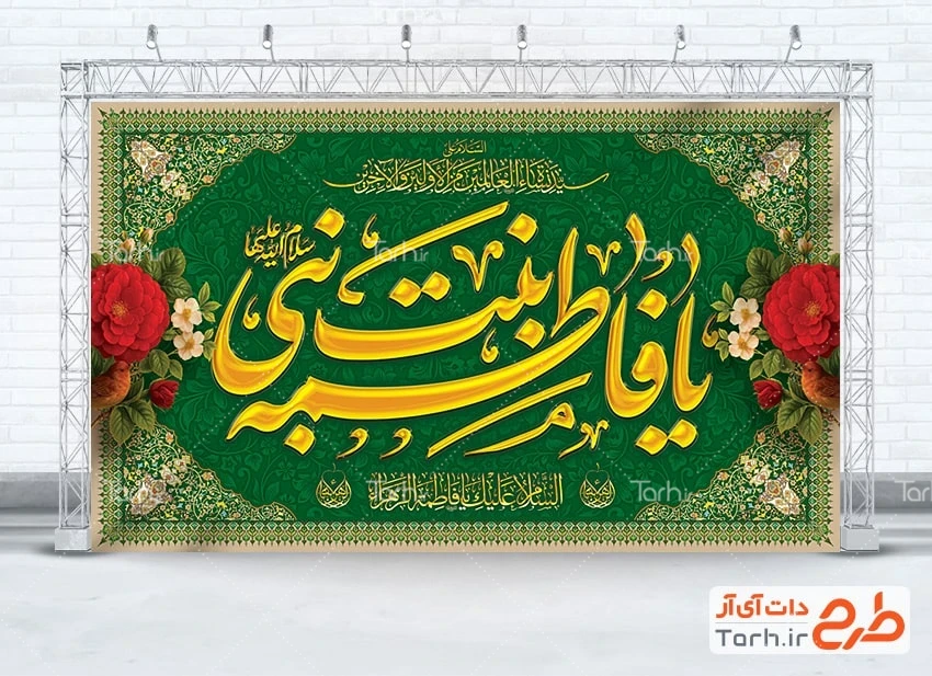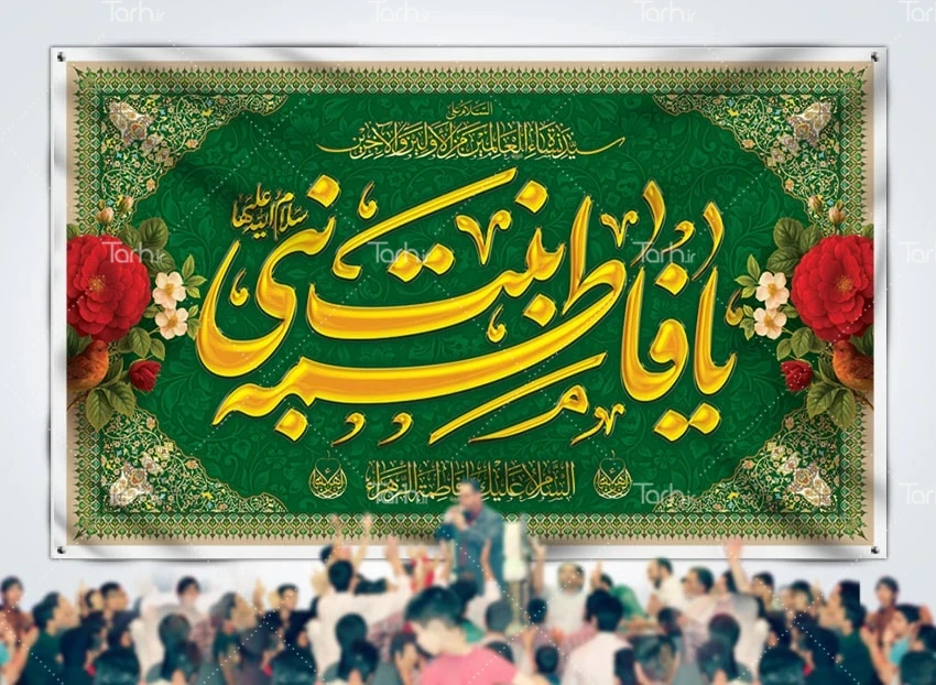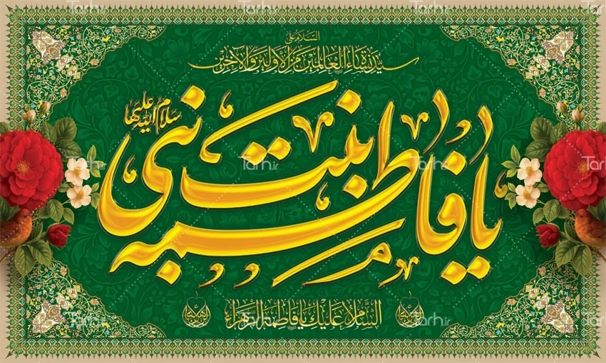 طرح لایه باز بنر کتیبه ولادت حضرت فاطمه دارای خوشنویسی یا فاطمه بنت نبی کد فایل 8397016
