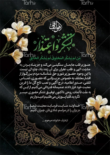 طرح خام آگهی تشکر و اعتذار دارای خوشنویسی هوالباقی کد فایل 8406579