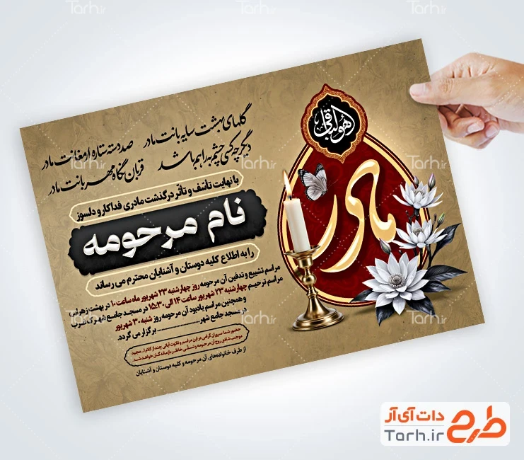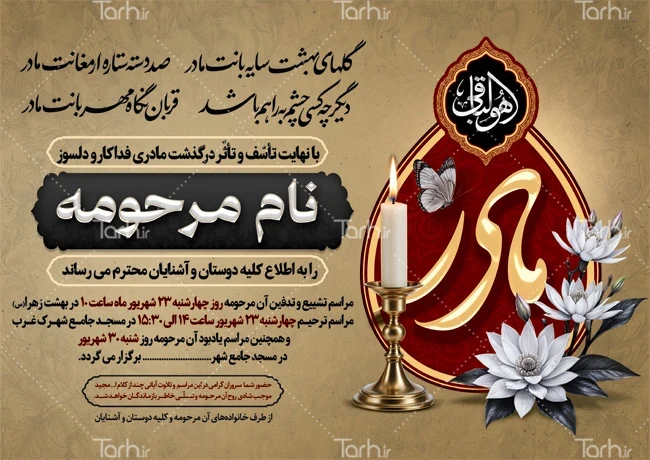 طرح خام آگهی ترحیم مادر با فرمت psd و قابل ویرایش در نرمافزار فتوشاپ بهصورت لایه باز توسط تیم طراحان طرح دات آی آر طراحی شده است. در فایل اعلامیه ترحیم مادر از تصاویر و المانهای باکیفیت و متناسب با استاندارد چاپ استفادهشده، همچنین نکات مهم در طرح آگهی ترحیم مادر مانند رنگبندی، رعایت حاشیه، فاصلهها، فضای کافی برای درج متن، سایز و نوع فونت مناسب طراحی آگهی ترحیم و ... رعایت گردیده است. طرح لایه باز آگهی فوت مادر شامل تایپوگرافی شعر گلهای بهشت سایه بانت مادر، هوالباقی، وکتور شمع و گل میباشد که المانهای استفادهشده در آگهی ترحیم لایه باز مادر قابلیت ویرایش، جابهجایی و تغییر سایز را دارا بوده و شما میتوانید متناسب باسلیقه خودتان نمونه اعلامیه ترحیم مادر را ویرایش نمایید.