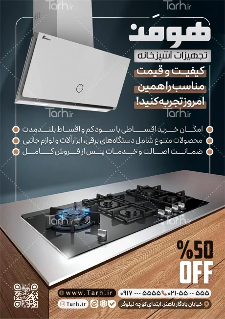 تراکت خام تجهیزات آشپزخانه با فرمت psd و قابل ویرایش در نرمافزار فتوشاپ بهصورت لایه باز توسط تیم طراحان طرح دات آی آر طراحی شده است. در نمونه تراکت تجهیزات آشپزخانه از تصاویر و المانهای باکیفیت و متناسب با استاندارد چاپ استفادهشده، همچنین نکات مهم در طرح تراکت تجهیزات آشپزخانه مانند رنگبندی، رعایت حاشیه، فاصلهها، فضای کافی برای درج متن، سایز و نوع فونت مناسب طراحی تراکت و ... رعایت گردیده است. طرح لایه باز تراکت فروشگاه هود سینک گاز شامل عکس گاز صفحه ای و هود میباشد که المانهای استفادهشده در طرح تراکت فروشگاه هود سینک گاز قابلیت ویرایش، جابهجایی و تغییر سایز را دارا بوده و شما میتوانید متناسب باسلیقه خودتان تراکت لایه باز تجهیزات آشپزخانه را ویرایش نمایید، همچنین با تغییر تصاویر و متنها میتوانید طرح تراکت فروش لوازم آشپزخانه را به طرح تراکت کسب و کار مد نظر خود شخصی سازی نمایید.