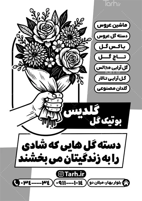 ابعاد تراکت تبلیغاتی سیاه و سفید گل فروشی در جدول ویژگیهای فایل درجشده و با توجه به لایه باز بودن و کیفیت بالای طرح تراکت ریسو گلفروشی، قابلیت ویرایش و تبدیل به سایز دلخواه، همچنین چاپ روی متریالهای مختلف مانند انواع کاغذ، گلاسه، کاغذ الوان و ... را دارا میباشد. همچنین میتوان طرح سیاه سفید سرای گل را در زمینه های چاپ سیلک ، نایلون، ساک دستی، پاکت دستی و کیسه نیز استفاده کرد. تراکت های سیاه سفید یا ریسو یک ابزار تبلیغاتی بسیار موثر محسوب می شوند و به دلیل هزینه کم و تأثیر بالا، در بسیاری از کسب و کارها به عنوان روشی اقتصادی و موثر برای انتقال اطلاعات به مخاطبان برای تبلیغات و رویدادهای مختلف استفاده میشوند.