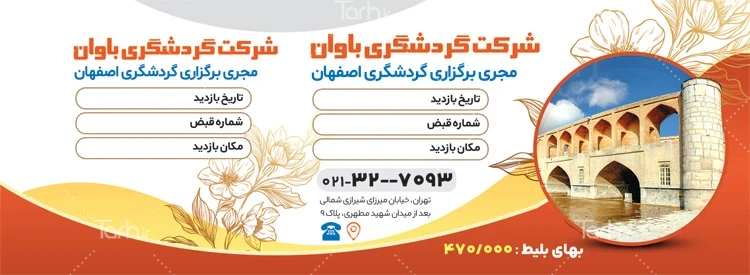 طرح آماده رسید مکانهای دیدنی اصفهان با فرمت psd و قابل ویرایش در نرمافزار فتوشاپ بهصورت لایه باز توسط تیم طراحان طرح دات آی آر طراحی شده است. در نمونه قبض شرکت از تصاویر و المانهای باکیفیت و متناسب با استاندارد چاپ استفادهشده، همچنین نکات مهم در طرح قبض رسید مکان های گردشگری مانند رنگبندی، رعایت حاشیه، فاصلهها، فضای کافی برای درج متن، سایز و نوع فونت مناسب قبض سی و سه پل خام و ... رعایت گردیده است. طرح لایه باز قبض مکانهای گردشگری شامل عکس سی و سه پل میباشد که المانهای استفادهشده در فرم خام قبض گردشگری قابلیت ویرایش، جابهجایی و تغییر سایز را دارا بوده و شما میتوانید متناسب باسلیقه خودتان قبض لایه باز گردشگری را ویرایش نمایید، همچنین با تغییر تصاویر و متنها میتوانید طرح قبض گردشگری لایه باز را به طرح قبض کسب و کار مد نظر خود شخصی سازی نمایید.