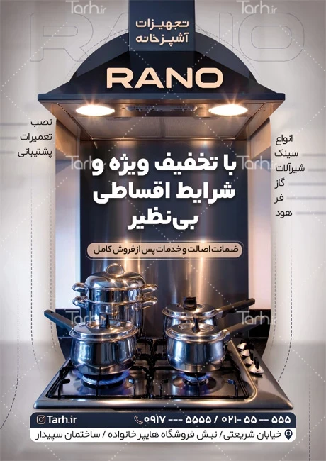 فایل لایه باز تراکت تجهیزات آشپزخانه با فرمت psd و قابل ویرایش در نرمافزار فتوشاپ بهصورت لایه باز توسط تیم طراحان طرح دات آی آر طراحی شده است. در نمونه تراکت تجهیزات آشپزخانه از تصاویر و المانهای باکیفیت و متناسب با استاندارد چاپ استفادهشده، همچنین نکات مهم در طرح تراکت تجهیزات آشپزخانه مانند رنگبندی، رعایت حاشیه، فاصلهها، فضای کافی برای درج متن، سایز و نوع فونت مناسب طراحی تراکت و ... رعایت گردیده است. طرح لایه باز تراکت فروشگاه هود سینک گاز شامل عکس گاز و هود میباشد که المانهای استفادهشده در طرح تراکت فروشگاه هود سینک گاز قابلیت ویرایش، جابهجایی و تغییر سایز را دارا بوده و شما میتوانید متناسب باسلیقه خودتان تراکت لایه باز تجهیزات آشپزخانه را ویرایش نمایید، همچنین با تغییر تصاویر و متنها میتوانید طرح تراکت فروش لوازم آشپزخانه را به طرح تراکت کسب و کار مد نظر خود شخصی سازی نمایید.