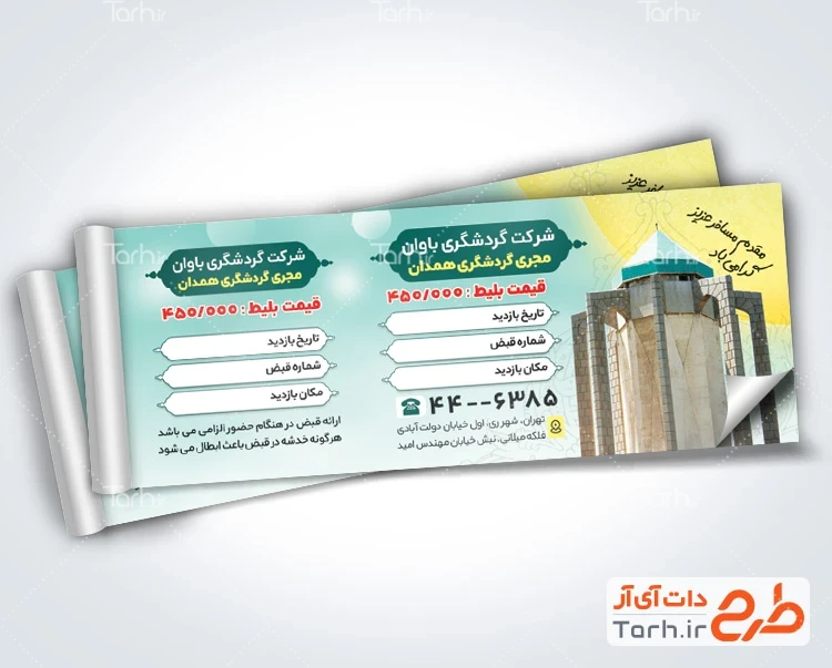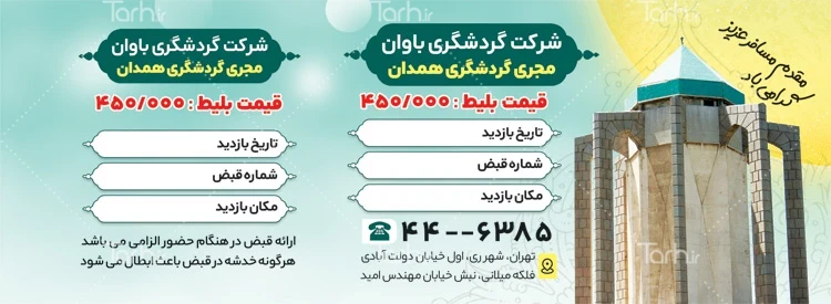 طرح قبض مجموعه گردشگری ویژه همدان با فرمت psd و قابل ویرایش در نرمافزار فتوشاپ بهصورت لایه باز توسط تیم طراحان طرح دات آی آر طراحی شده است. در نمونه قبض شرکت گردشگری از تصاویر و المانهای باکیفیت و متناسب با استاندارد چاپ استفادهشده، همچنین نکات مهم در طرح قبض رسید مکان های گردشگری مانند رنگبندی، رعایت حاشیه، فاصلهها، فضای کافی برای درج متن، سایز و نوع فونت مناسب قبض همدان خام و ... رعایت گردیده است. طرح لایه باز قبض مکانهای گردشگری شامل عکس مکان های دیدنی همدان عکس آرامگاه باباطاهر عریان میباشد که المانهای استفادهشده در فرم خام قبض گردشگری قابلیت ویرایش، جابهجایی و تغییر سایز را دارا بوده و شما میتوانید متناسب باسلیقه خودتان قبض لایه باز گردشگری را ویرایش نمایید، همچنین با تغییر تصاویر و متنها میتوانید طرح قبض گردشگری لایه باز را به طرح قبض کسب و کار مد نظر خود شخصی سازی نمایید.