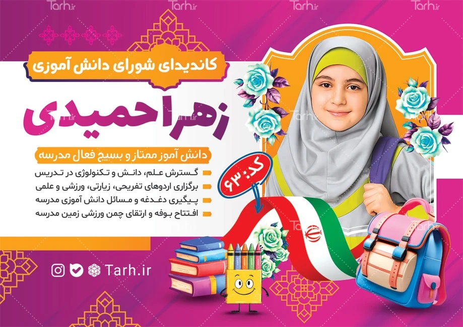 طرح تراکت تبلیغاتی انتخابات شورای مدرسه با فرمت psd و قابل ویرایش در نرمافزار فتوشاپ بهصورت لایه باز توسط تیم طراحان طرح دات آی آر طراحی شده است. در نمونه تراکت انتخابات شورای دانش آموزی از تصاویر و المانهای باکیفیت و متناسب با استاندارد چاپ استفادهشده، همچنین نکات مهم در تراکت لایه باز انتخابات دانش آموزی مانند رنگبندی، رعایت حاشیه، فاصلهها، فضای کافی برای درج متن، سایز و نوع فونت مناسب طراحی تراکت و ... رعایت گردیده است. طرح لایه باز تراکت انتخابات شورای مدرسه شامل عکس دانش آموز میباشد که المانهای استفادهشده در طرح تراکت انتخابات شورای دانش آموزی مدرسه قابلیت ویرایش، جابهجایی و تغییر سایز را دارا بوده و شما میتوانید متناسب باسلیقه خودتان پوستر لایه باز انتخابات شورای دانش آموزی را ویرایش نمایید، همچنین با تغییر تصاویر و متنها میتوانید طرح تراکت انتخابات دانش آموزی را به طرح تراکت کسب و کار مد نظر خود شخصی سازی نمایید.