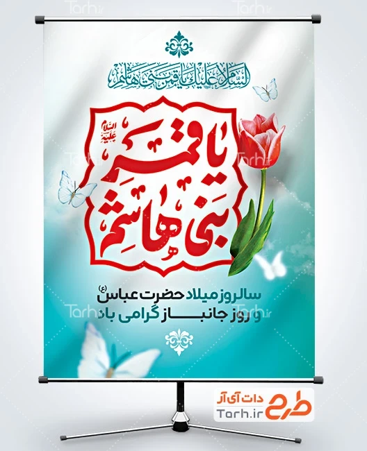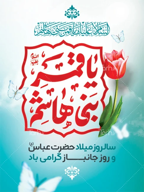 طرح بنر ولادت حضرت ابوالفضل و روز جانباز با تایپوگرافی یا قمر بنی هاشم کد فایل 8571943