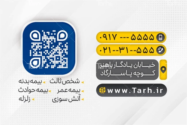 طرح خام کارت ویزیت دفتر بیمه معلم با فرمت psd و قابل ویرایش در نرمافزار فتوشاپ بهصورت لایه باز و پشت و رو (دو رو) توسط تیم طراحان طرح دات آی آر طراحی شده است. کارت ویزیت لایه باز دفتر بیمه از تصاویر و المانهای باکیفیت و متناسب با استاندارد چاپ استفادهشده، همچنین نکات مهم در طرح کارت ویزیت مانند رنگبندی، رعایت حاشیه، فاصلهها، فضای کافی برای درج متن، سایز و نوع فونت مناسب طراحی کارت ویزیت و ... رعایت گردیده است. نمونه کارت ویزیت بیمه معلم شامل لوگو بیمه معلم میباشد که المانهای استفادهشده در طرح کارت ویزیت دفتر بیمه قابلیت ویرایش، جابهجایی و تغییر سایز را دارا بوده و شما میتوانید متناسب باسلیقه خودتان کارت ویزیت آماده بیمه معلم را ویرایش نمایید، همچنین با تغییر تصاویر و متنها میتوانید طرح کارت ویزیت شرکت بیمه را به طرح کارت ویزیت کسب و کار مد نظر خود شخصی سازی نمایید.