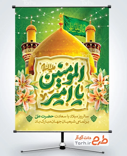 طرح پوستر ولادت امام علی شامل خوشنویسی یا امیرالمومنین کد فایل 8674925