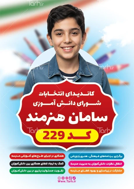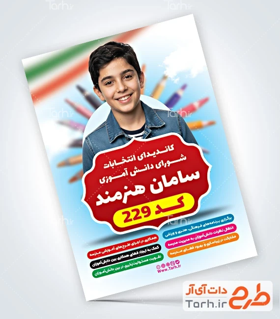 طرح تراکت خام کاندیدای انتخابات شورای دانش آموزی با عکس دانش آموز پسر کد فایل 8694231