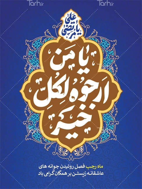 پوستر تبریک آغاز ماه رجب با فرمت psd و قابل ویرایش در نرم افزار فتوشاپ به صورت لایه باز توسط تیم طراحان طرح دات آی آر طراحی شده است. در طرح لایه باز ماه رجب از تصاویر و المان های با کیفیت و متناسب با استاندارد چاپ استفاده گردیده است. طرح پوستر ماه رجب شامل خوشنویسی یا من ارجوه لکل خیر، یا مرتضی علی و طرح اسلیمی می باشد که المان های استفاده شده در طرح بنر ماه رجب قابلیت ویرایش، جابه جایی و تغییر سایز را دارا بوده و شما می توانید متناسب با سلیقه خودتان طرح بنر حلول ماه رجب را ویرایش نمایید.