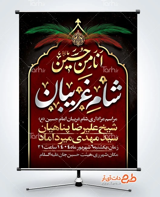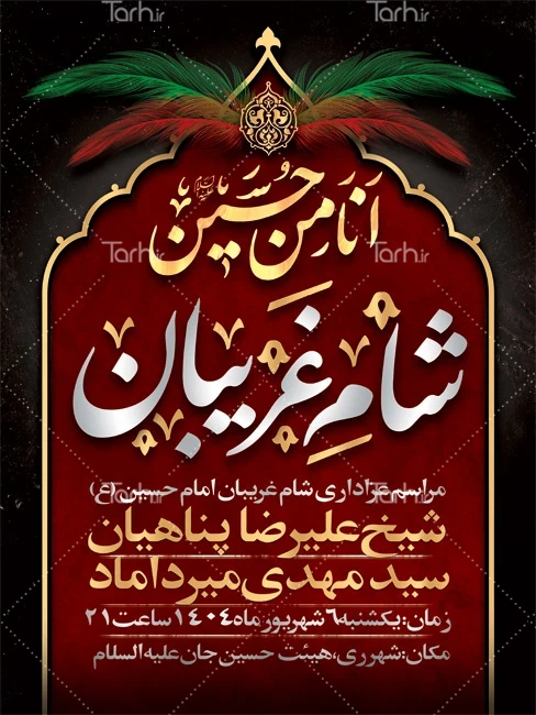 بنر لایه باز اطلاع رسانی شام غریبان با فرمت psd و قابل ویرایش در نرم افزار فتوشاپ به صورت لایه باز توسط تیم طراحان طرح دات آی آر طراحی شده است. در طرح لایه باز اطلاعیه شام غریبان از تصاویر و المان های با کیفیت و متناسب با استاندارد چاپ استفاده گردیده است. طرح بنر اطلاعیه محرم شامل تایپوگرافی شام غریبان، انا من حسین و دارای زمان و مکان مراسم روضه و عزاداری می باشد که المان های استفاده شده در طرح بنر اطلاع رسانی محرم قابلیت ویرایش، جابه جایی و تغییر سایز را دارا بوده و شما می توانید متناسب با سلیقه خودتان طرح اطلاعیه شام غریبان را ویرایش نمایید.
