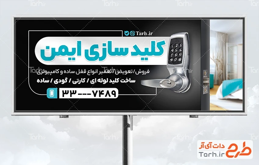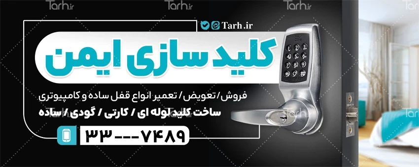 دانلود طرح بنر کلید سازی با فرمت psd و قابل ویرایش در نرمافزار فتوشاپ بهصورت لایه باز توسط تیم طراحان طرح دات آی آر طراحی شده است. در طرح لایه باز بنر کلید سازی از تصاویر و المانهای باکیفیت و متناسب با استاندارد چاپ استفادهشده، همچنین نکات مهم در طرح بنر مشاغل مانند رنگبندی، رعایت حاشیه، فاصلهها، سایز و نوع فونت مناسب طراحی تابلو مشاغل و ... رعایت گردیده است. طرح لایه باز بنر کلید سازی شامل عکس قفل و کلید میباشد که المانهای استفادهشده در طرح تابلو الکترو کلید سازی قابلیت ویرایش، جابهجایی و تغییر سایز را دارا بوده و شما میتوانید متناسب باسلیقه خودتان طرح بنر تبلیغاتی کلید سازی را ویرایش نمایید، همچنین با تغییر تصاویر و متنها میتوانید طرح تابلو تبلیغاتی کلیدسازی را به طرح تابلوی شغل موردنظر خود تبدیل نمایید.