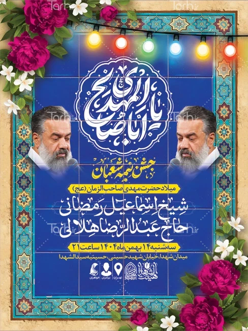 طرح بنر اطلاعیه ولادت امام زمان با فرمت psd و قابل ویرایش در نرم افزار فتوشاپ به صورت لایه باز توسط تیم طراحان طرح دات آی آر طراحی شده است. در پوستر نیمه شعبان از تصاویر و المان های با کیفیت و متناسب با استاندارد چاپ استفاده گردیده است. طرح بنر ولادت امام زمان و نیمه شعبان شامل تایپوگرافی یا اباصالح المهدی، تایپوگرافی جشن نیمه شعبان و دارای زمان و مکان مراسم جشن میباشد. در بنر اطلاع رسانی جشن میلاد امام زمان اطلاعات زمان و مکان مراسم، مداح و سخنرانان درج شده است. المانهای استفاده شده در بنر اطلاعیه نیمه شعبان قابلیت ویرایش، جابهجایی و تغییر سایز را دارا بوده و شما میتوانید متناسب با سلیقه خودتان طرح اطلاعیه خام میلاد امام زمان و نیمه شعبان را ویرایش نمایید.