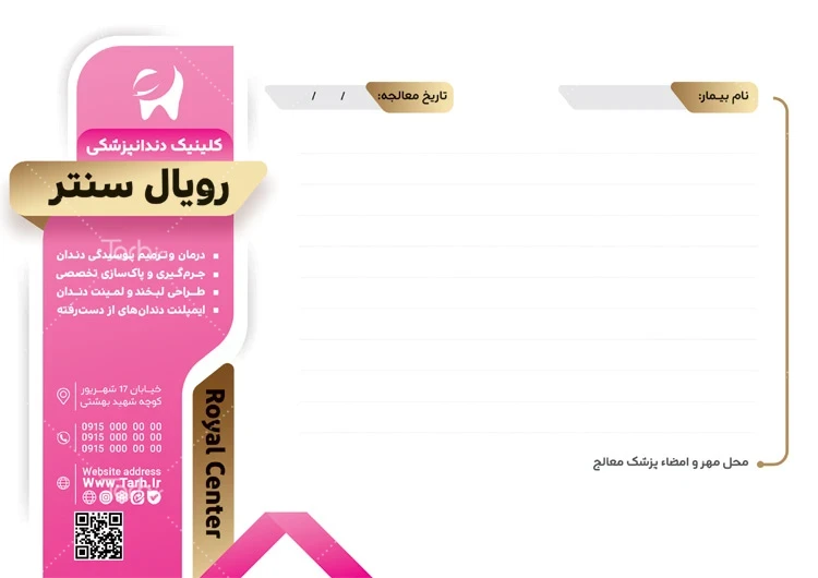 دانلود سرنسخه دکتر دندان پزشک با فرمت psd و قابل ویرایش در نرمافزار فتوشاپ بهصورت لایه باز توسط تیم طراحان طرح دات آی آر طراحی شده است. در طرح لایه باز سرنسخه دندانپزشکی از المانهای باکیفیت و متناسب با استاندارد چاپ استفادهشده، همچنین نکات مهم در طرح سرنسخه دندانپزشکی مانند رنگبندی، رعایت حاشیه، فاصلهها، فضای کافی برای درج متن، سایز و نوع فونت مناسب طراحی سرنسخه و ... رعایت گردیده است. سرنسخه خام دندانپزشکی شامل محل جایگذاری اطلاعات بیمار و نام پزشک میباشد که المانهای استفادهشده در طرح سرنسخه دندان پزشکی قابلیت ویرایش، جابهجایی و تغییر سایز را دارا بوده و شما میتوانید متناسب باسلیقه خودتان طرح سر نسخه پزشک را ویرایش نمایید، همچنین با تغییر لوگو و متنها میتوانید طرح سرنسخه دندانپزشک را به طرح سربرگ دکتر مد نظر خود شخصی سازی نمایید. سربرگ نسخه پزشک به عنوان یک قالب یا برگه کاغذی با سربرگ توسط پزشکان و متخصصان پزشکی برای ایجاد نسخههای مختلف، تجویز دارو، اسناد پزشکی و نامههای پزشکی مورد استفاده قرار میگیرد. سربرگ پزشک معمولاً اطلاعات و مشخصات پزشک را دربرمیگیرد و به پزشکان کمک میکند تا ارتباطات خود با بیماران، دیگر پزشکان، و سایر نهادها را به صورت حرفهای و معتبر انجام دهند و اصالت اسناد پزشکی را حفظ کنند.