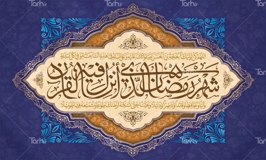 طرح بنر کتیبه پشت منبری ماه رمضان دارای تایپوگرافی شهر رمضان الذی انزل فیه القرآن کد فایل 8972104