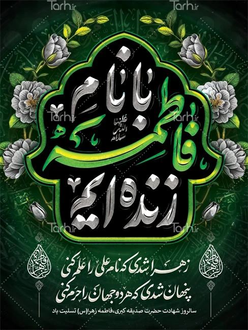 طرح بنر خام ایام فاطمیه شامل تایپوگرافی با نام فاطمه زنده ایم کد فایل 8973561
