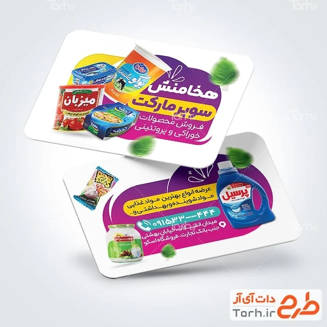 طرح آماده کارت ویزیت سوپر مارکت با فرمت psd و قابل ویرایش در نرمافزار فتوشاپ بهصورت لایه باز و پشت و رو (دو رو) توسط تیم طراحان طرح دات آی آر طراحی شده است. طرح کارت ویزیت سوپری از تصاویر و المانهای باکیفیت و متناسب با استاندارد چاپ استفادهشده، همچنین نکات مهم در طرح کارت ویزیت مانند رنگبندی، رعایت حاشیه، فاصلهها، فضای کافی برای درج متن، سایز و نوع فونت مناسب طراحی کارت ویزیت و ... رعایت گردیده است. طرح کارت ویزیت هایپر مارکت شامل عکس مواد غذایی میباشد که المانهای استفادهشده در طرح کارت ویزیت سوپرمارکت قابلیت ویرایش، جابهجایی و تغییر سایز را دارا بوده و شما میتوانید متناسب باسلیقه خودتان کارت ویزیت لایه باز سوپری را ویرایش نمایید، همچنین با تغییر تصاویر و متنها میتوانید طرح کارت ویزیت سوپری را به طرح کارت ویزیت کسب و کار مد نظر خود شخصی سازی نمایید.