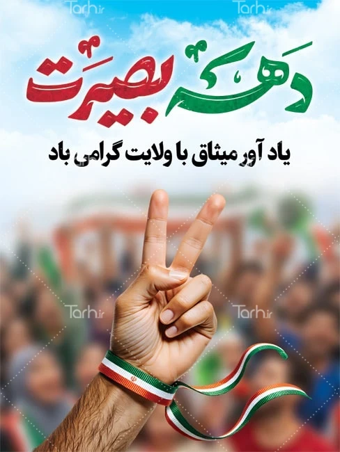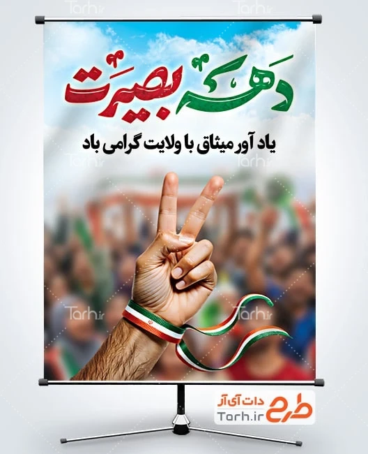 طرح بنر آماده دهه بصیرت با فرمت psd و قابل ویرایش در نرم افزار فتوشاپ به صورت لایه باز توسط تیم طراحان طرح دات آی آر طراحی شده است. در طرح بنر تبریک روز بصیرت و میثاق امت با ولایت از تصاویر و المان های با کیفیت و متناسب با استاندارد چاپ استفاده گردیده است. طرح آماده بنر روز بصیرت شامل خوشنویسی دهه بصیرت، عکس دست با مچ بند پرچم ایران می باشد که المان های استفاده شده در طرح لایه باز بنر دهه بصیرت قابلیت ویرایش، جابه جایی و تغییر سایز را دارا بوده و شما می توانید متناسب با سلیقه خودتان طرح بنر حماسه 9 دی را ویرایش نمایید.