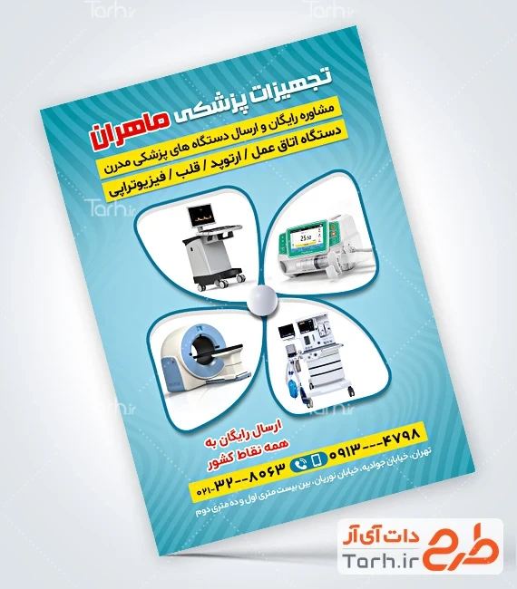 طرح لایه باز تراکت فروشگاه لوازم پزشکی با عکس لوازم پزشکی کد فایل 9027158