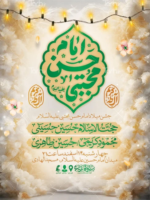 دانلود طرح بنر اطلاع رسانی ولادت امام حسن با فرمت psd و قابل ویرایش در نرم افزار فتوشاپ به صورت لایه باز توسط تیم طراحان طرح دات آی آر طراحی شده است. در طرح لایه باز اطلاعیه ولادت امام حسن مجتبی از تصاویر و المان های با کیفیت و متناسب با استاندارد چاپ استفاده گردیده است. طرح پوستر اطلاعیه ولادت امام حسن شامل تایپوگرافی امام حسن مجتبی، کریم آل طه و دارای زمان و مکان مراسم میباشد که المان های استفاده شده در بنر لایه باز اطلاع رسانی جشن ولادت امام حسن مجتبی قابلیت ویرایش، جابه جایی و تغییر سایز را دارا بوده و شما می توانید متناسب با سلیقه خودتان طرح بنر ولادت امام حسن مجتبی را ویرایش نمایید.