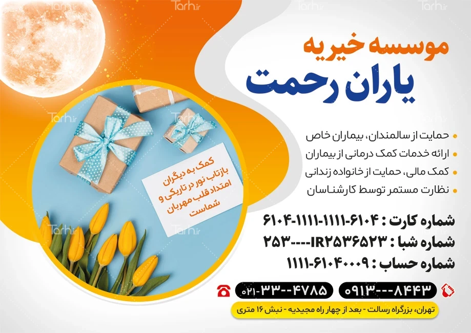 طرح لایه باز تراکت انجمن خیریه با عکس جعبه هدیه کد فایل 9051284