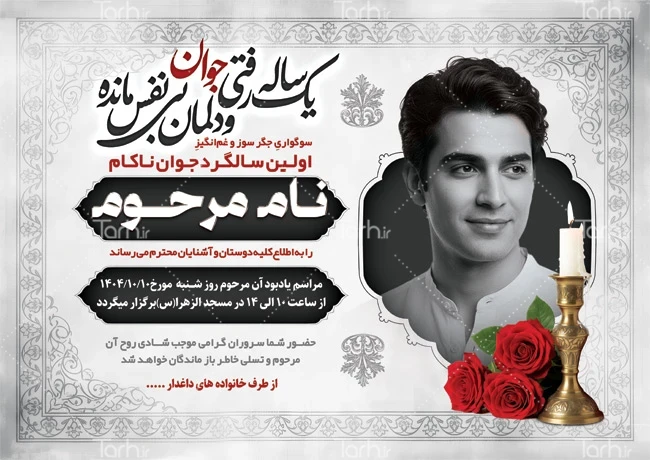 طرح آماده آگهی ترحیم سالگرد جوان ناکام دارای خوشنویسی یک ساله رفتی جوان و دلمان بی نفس مانده کد فایل 9107485