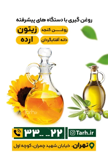 طرح psd کارت ویزیت روغن گیری با فرمت psd و قابل ویرایش در نرمافزار فتوشاپ بهصورت لایه باز و پشت و رو (دو رو) توسط تیم طراحان طرح دات آی آر طراحی شده است. طرح کارت ویزیت روغن گیری از تصاویر و المانهای باکیفیت و متناسب با استاندارد چاپ استفادهشده، همچنین نکات مهم در طرح کارت ویزیت مانند رنگبندی، رعایت حاشیه، فاصلهها، فضای کافی برای درج متن، سایز و نوع فونت مناسب طراحی کارت ویزیت و ... رعایت گردیده است. نمونه کارت ویزیت روغن گیری شامل عکس روغن زیتون، تصویرساز کودک و مزرعه میباشد که المانهای استفادهشده در طرح کارت ویزیت عصاری و روغن کنجد و ارده گیری قابلیت ویرایش، جابهجایی و تغییر سایز را دارا بوده و شما میتوانید متناسب باسلیقه خودتان کارت ویزیت لایه باز روغن گیری را ویرایش نمایید، همچنین با تغییر تصاویر و متنها میتوانید طرح کارت ویزیت روغن گیاهی را به طرح کارت ویزیت کسب و کار مد نظر خود شخصی سازی نمایید.