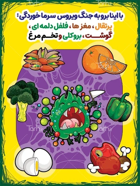 طرح لایه باز پوستر پیشگیری از سرماخوردگی با تصویرسازی مواد غذایی کد فایل 9128537