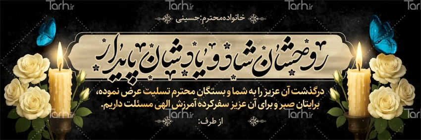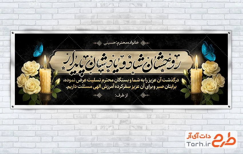 طرح قابل ویرایش پلاکارد تسلیت مرحوم با فرمت psd و قابل ویرایش در نرم افزار فتوشاپ به صورت لایه باز توسط تیم طراحان طرح دات آی آر طراحی شده است. در طرح لایه باز تسلیت از تصاویر و المان های با کیفیت و متناسب با استاندارد چاپ استفاده گردیده است. طرح بنر تسلیت شامل خوشنویسی روحشان شاد و یادشان پایدار باشد که المان های استفاده شده در بنر لایه باز تسلیت قابلیت ویرایش، جابه جایی و تغییر سایز را دارا بوده و شما می توانید متناسب با سلیقه خودتان طرح عرض تسلیت را ویرایش نمایید.