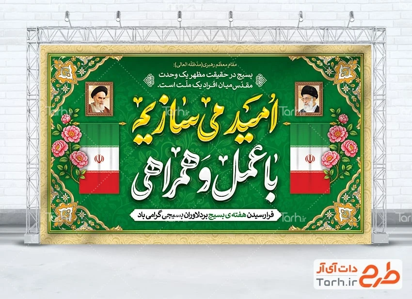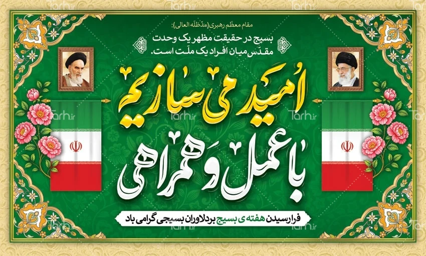 دانلود طرح لایه باز بنر هفته بسیج با فرمت psd و قابل ویرایش در نرم افزار فتوشاپ به صورت لایه باز توسط تیم طراحان طرح دات آی آر طراحی شده است. در طرح لایه باز بنر هفته بسیج از تصاویر و المان های با کیفیت و متناسب با استاندارد چاپ استفاده گردیده است. طرح لایه باز هفته بسیج شامل خوشنویسی امید می سازیم با عمل و همراهی، قاب عکس رهبر و امام خمینی و وکتور پرچم ایران می باشد که المان های استفاده شده در طرح خام هفته بسیج قابلیت ویرایش، جابه جایی و تغییر سایز را دارا بوده و شما می توانید متناسب با سلیقه خودتان طرح هفته بسیج را ویرایش نمایید.