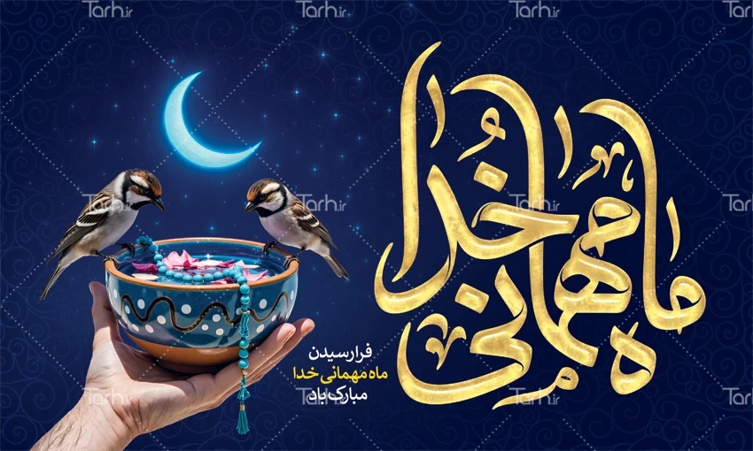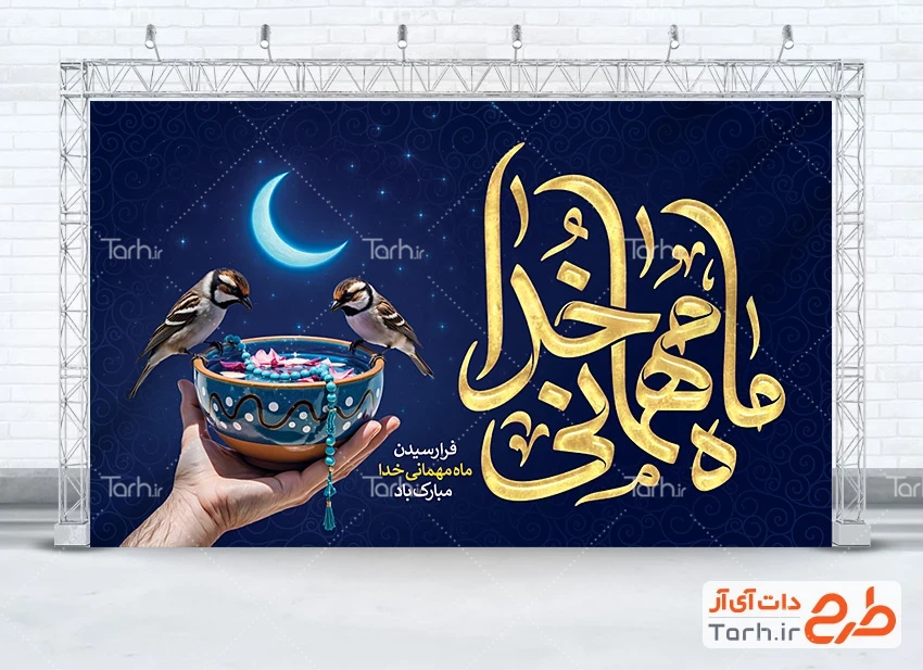 طرح لایه باز بنر پشت منبری حلول ماه رمضان با تایپوگرافی ماه مهمانی خدا کد فایل 9173084