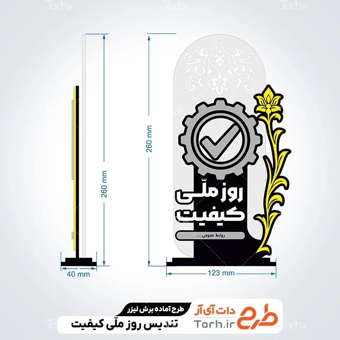 دانلود لیزر تندیس روز کیفیت با نرم افزار Corel Draw به صورت لایه باز و قابل ویرایش توسط تیم طراحان طرح دات آی آر طراحی شده است. در طرح آماده برش لیزری استند کیفیت نکات مهم طراحی لیزر مانند رعایت ضخامت چوب، ابعاد استاندارد طرح و چیدمان درست برای کمترین پرتی رعایت گردیده است. طرح برش لیزری تندیس روز کیفیت، آماده اجرا توسط دستگاه های برش، سی ان سی (CNC)، حکاکی لیزر و حکاکی روی چوب میباشد. شما میتوانید از طرح لیزر کیفیت جهت تولید انواع تندیس و استند روز جهانی کیفیت به عنوان هدیه در مراسمات روز جهانی کیفیت استفاده کنید.