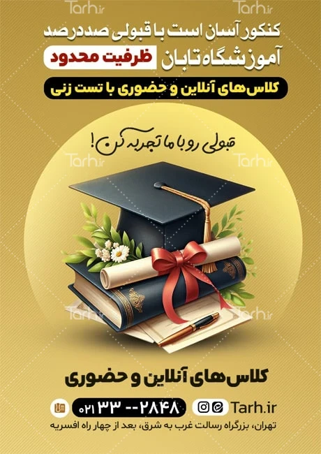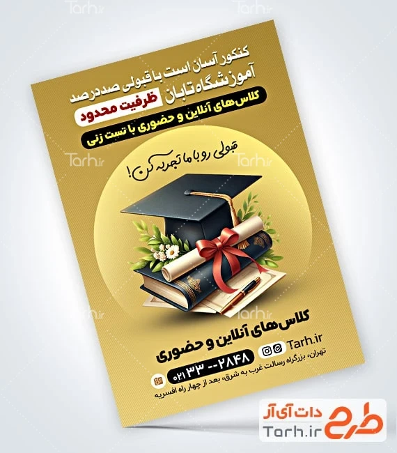 طرح تراکت تبلیغاتی آموزشگاه کنکور با فرمت psd و قابل ویرایش در نرمافزار فتوشاپ بهصورت لایه باز توسط تیم طراحان طرح دات آی آر طراحی شده است. در نمونه تراکت تبلیغاتی آموزشگاه کنکور از تصاویر و المانهای باکیفیت و متناسب با استاندارد چاپ استفادهشده، همچنین نکات مهم در طرح تراکت کلاس کنکور مانند رنگبندی، رعایت حاشیه، فاصلهها، فضای کافی برای درج متن، سایز و نوع فونت مناسب طراحی تراکت و ... رعایت گردیده است. طرح لایه باز تراکت آموزشگاه کنکور شامل عکس کلاه فارغ التحصیلی و کتاب میباشد که المانهای استفادهشده در طرح تراکت خام آموزشگاه کنکور قابلیت ویرایش، جابهجایی و تغییر سایز را دارا بوده و شما میتوانید متناسب باسلیقه خودتان تراکت لایه باز کلاس کنکور را ویرایش نمایید، همچنین با تغییر تصاویر و متنها میتوانید طرح تراکت آموزشگاه کنکور را به طرح تراکت کسب و کار مد نظر خود شخصی سازی نمایید.