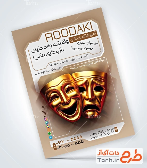 طرح لایه باز تراکت آموزشگاه بازیگری شامل عکس ماسک شادی و غم کد فایل 9286140