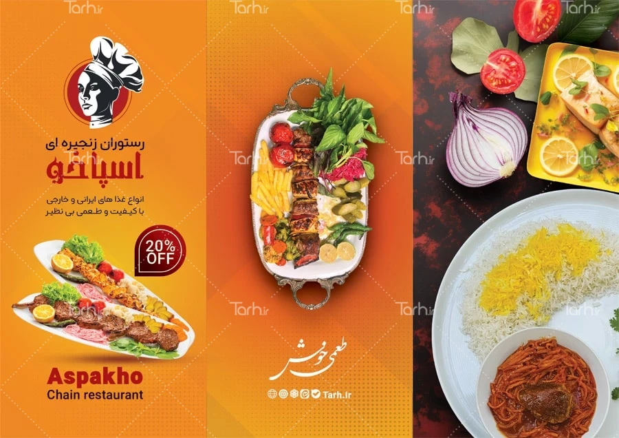 طرح لایه باز منو بروشوری رستوران با فرمت psd و قابل ویرایش در نرم افزار فتوشاپ به صورت لایه باز توسط تیم طراحان طرح دات آی آر طراحی شده است. در بروشور لایه باز منوی غذا که غالباً در قالب سه و چهار لت (چند لتی) طراحی میشود از تصاویر و المان های با کیفیت و متناسب با استاندارد چاپ استفاده گردیده است. طرح بروشور منو رستوران شامل عکس بشقاب غذای ایرانی و لیست قیمت غذاها می باشد که المان های استفاده شده در بروشور لایه باز منو رستوران قابلیت حذف، ویرایش، جابه جایی و تغییر سایز را دارا بوده و شما می توانید متناسب با سلیقه خودتان طرح بروشور منو غذا را ویرایش نمایید.