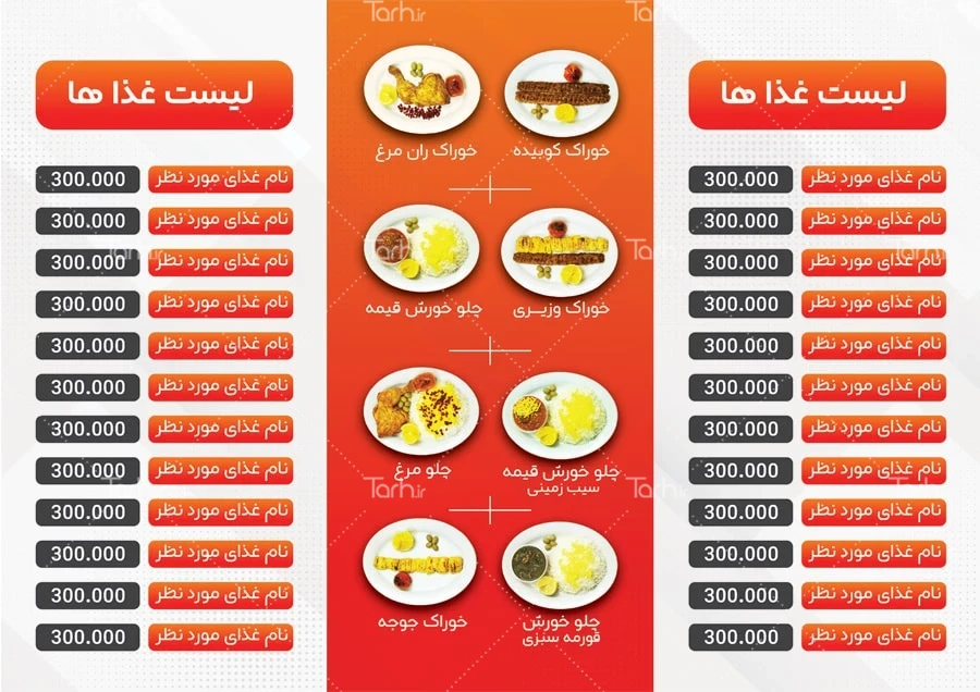طرح لایه باز منو بروشوری رستوران با لیست قیمت غذا کد فایل 9327085