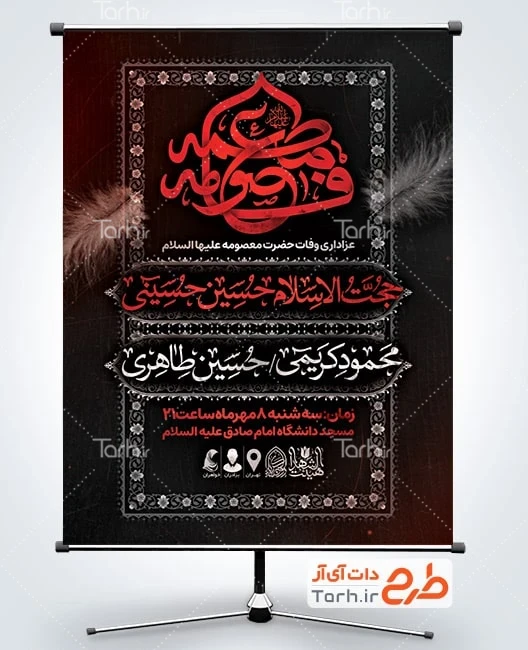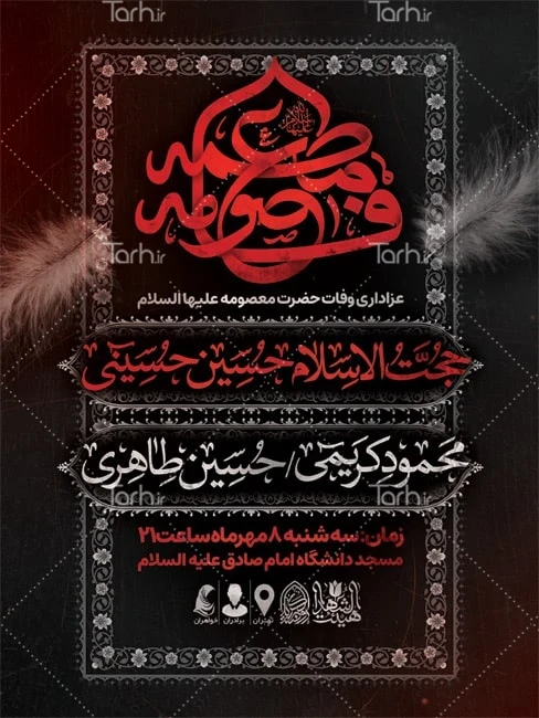طرح لایه باز پوستر وفات حضرت معصومه با فرمت psd و قابل ویرایش در نرم افزار فتوشاپ به صورت لایه باز توسط تیم طراحان طرح دات آی آر طراحی شده است. در طرح بنر شهادت حضرت معصومه از تصاویر و المان های با کیفیت و متناسب با استاندارد چاپ استفاده گردیده است. طرح لایه باز بنر اطلاع رسانی شهادت حضرت معصومه شامل خوشنویسی فاطمه معصومه و وکتور کبوتر می باشد که المان های استفاده شده در پوستر لایه باز وفات حضرت معصومه قابلیت ویرایش، جابه جایی و تغییر سایز را دارا بوده و شما می توانید متناسب با سلیقه خودتان طرح پوستر اطلاعیه وفات حضرت معصومه را ویرایش نمایید.