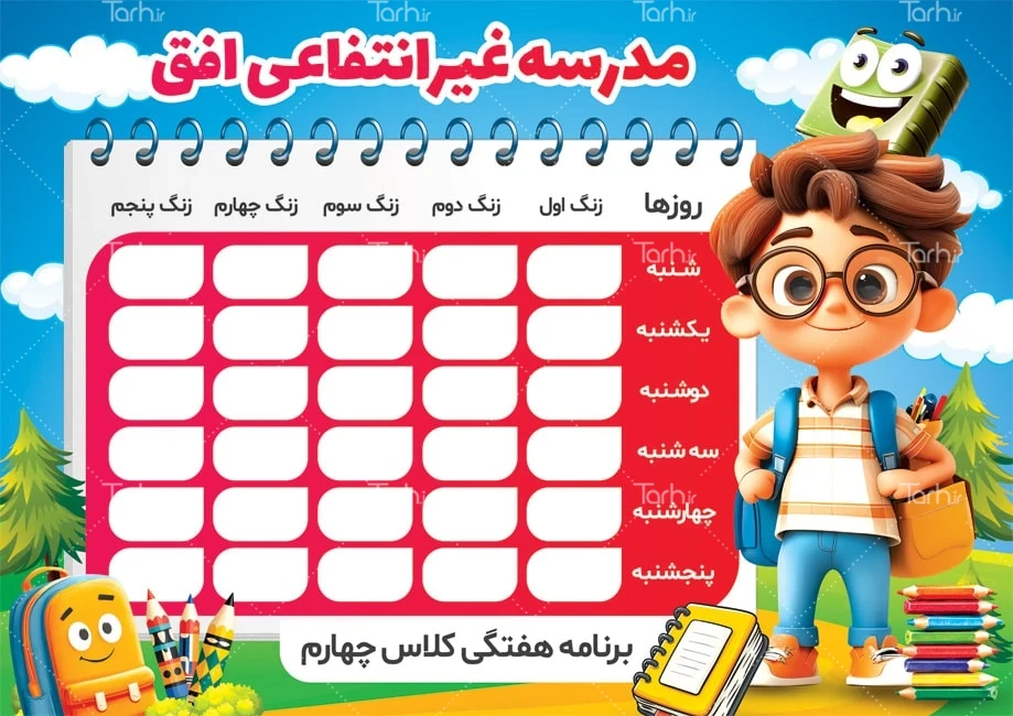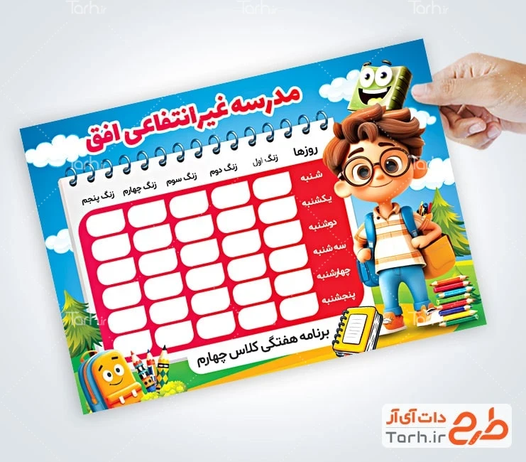 نمونه برنامه کلاسی با فرمت psd و قابل ویرایش در نرم افزار فتوشاپ به صورت لایه باز توسط تیم طراحان طرح دات آی آر طراحی شده است. در طرح برنامه هفتگی مدرسه از تصاویر و المانهای با کیفیت و متناسب با استاندارد چاپ استفاده شده است. طرح لایه باز برنامه کلاسی برای برنامه ریزی درسی هفتگی در مدارس، مراکز آموزشی و همچنین استفاده شخصی دانش آموزان کاربرد دارد. طرح آماده برنامه کلاسی مدرسه از جلمه برنامه هفتگی مدرسه ابتدایی شامل جدول برنامه کلاسی و تصویرسازی دانش آموز میباشد. المانهای استفاده شده در طرح برنامه هفتگی مدارس قابلیت ویرایش، جابه جایی و تغییر سایز را دارا بوده و شما می توانید متناسب با سلیقه خودتان طرح لایه باز برنامه هفتگی را ویرایش نمایید.