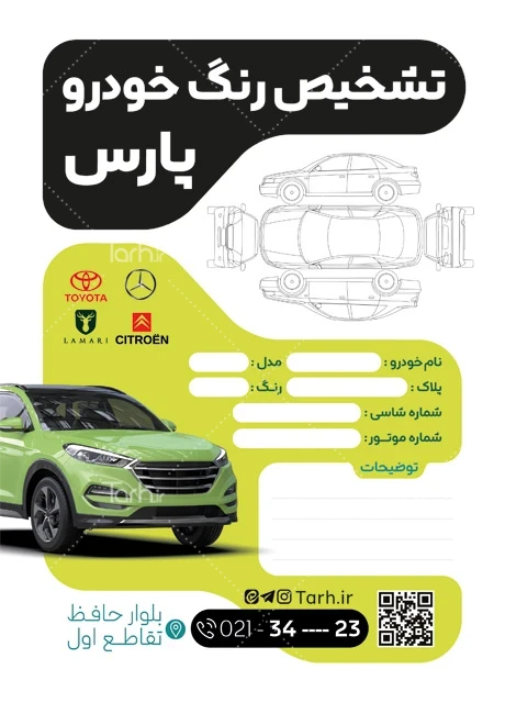 دانلود طرح فرم تشخیص رنگ خودرو با فرمت psd و قابل ویرایش در نرمافزار فتوشاپ بهصورت لایه باز توسط تیم طراحان طرح دات آی آر طراحی شده است. در نمونه تراکت تشخیص رنگ خودرو از تصاویر و المانهای باکیفیت و متناسب با استاندارد چاپ استفادهشده، همچنین نکات مهم در طرح برگه کارشناسی رنگ مانند رنگبندی، رعایت حاشیه، فاصلهها، فضای کافی برای درج متن، سایز و نوع فونت مناسب طراحی تراکت و ... رعایت گردیده است. طرح لایه باز برگه تشخیص رنگ خودرو شامل عکس خودرو و محل درج مشخصات مشتری میباشد که المانهای استفادهشده در طرح فرم کارشناسی و تشخیص رنگ قابلیت ویرایش، جابهجایی و تغییر سایز را دارا بوده و شما میتوانید متناسب باسلیقه خودتان فرم لایه باز تشخیص رنگ خودرو را ویرایش نمایید، همچنین با تغییر تصاویر و متنها میتوانید طرح فرم تشخیص رنگ ماشین را به طرح تراکت کسب و کار مد نظر خود شخصی سازی نمایید.