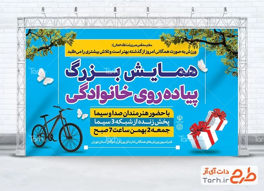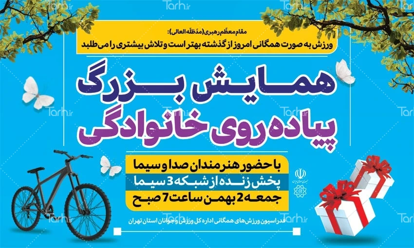 بنر خام همایش پیاده روی خانوادگی با فرمت psd و قابل ویرایش در نرم افزار فتوشاپ به صورت لایه باز توسط تیم طراحان طرح دات آی آر طراحی شده است. در طرح لایه باز همایش پیاده روی به مناسبت روز تربیت بدنی و ورزش از تصاویر و المان های با کیفیت و متناسب با استاندارد چاپ استفاده گردیده است. پوستر همایش پیاده روی شامل خوشنویسی همایش بزرگ پیاده روی خانوادگی، عکس دوچرخه و جعبه هدیه میباشد که المان های استفاده شده در بنر لایه باز همایش پیاده روی قابلیت ویرایش، جابه جایی و تغییر سایز را دارا بوده و شما می توانید متناسب با سلیقه خودتان طرح بنر همایش پیاده روی خانوادگی را ویرایش نمایید.