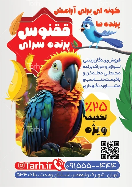 طرح خام تراکت پرنده فروشی با فرمت psd و قابل ویرایش در نرمافزار فتوشاپ بهصورت لایه باز توسط تیم طراحان طرح دات آی آر طراحی شده است. در نمونه تراکت پرنده سرا از تصاویر و المانهای باکیفیت و متناسب با استاندارد چاپ استفادهشده، همچنین نکات مهم در طرح تراکت فروشگاه پرنده طوطی ماکائو مانند رنگبندی، رعایت حاشیه، فاصلهها، فضای کافی برای درج متن، سایز و نوع فونت مناسب طراحی تراکت و ... رعایت گردیده است. طرح لایه باز تراکت پرنده فروشی شامل تصویرسازی پرنده میباشد که المانهای استفادهشده در تراکت لایه باز پرنده فروشی قابلیت ویرایش، جابهجایی و تغییر سایز را دارا بوده و شما میتوانید متناسب باسلیقه خودتان تراکت لایه باز پرنده سرا را ویرایش نمایید، همچنین با تغییر تصاویر و متنها میتوانید طرح تراکت فروش پرند را به طرح تراکت کسب و کار مد نظر خود شخصی سازی نمایید.