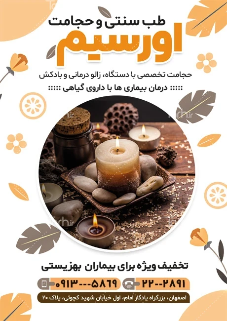 طرح پوستر تبلیغاتی حجامت و طب سنتی با فرمت psd و قابل ویرایش در نرمافزار فتوشاپ بهصورت لایه باز توسط تیم طراحان طرح دات آی آر طراحی شده است. در نمونه تراکت حجامت از تصاویر و المانهای باکیفیت و متناسب با استاندارد چاپ استفادهشده، همچنین نکات مهم در طرح تراکت حجامت مانند رنگبندی، رعایت حاشیه، فاصلهها، فضای کافی برای درج متن، سایز و نوع فونت مناسب طراحی تراکت و ... رعایت گردیده است. طرح لایه باز تراکت طب سنتی شامل عکس وسایل حجامت میباشد که المانهای استفادهشده در طرح تراکت طب سنتی قابلیت ویرایش، جابهجایی و تغییر سایز را دارا بوده و شما میتوانید متناسب باسلیقه خودتان تراکت لایه باز مرکز حجامت و طب سنتی را ویرایش نمایید، همچنین با تغییر تصاویر و متنها میتوانید طرح تراکت مرکز حجامت را به طرح تراکت کسب و کار مد نظر خود شخصی سازی نمایید.