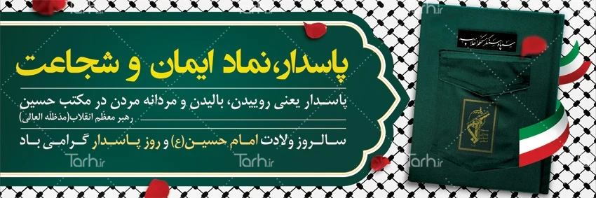 طرح پلاکارد روز پاسدار لایه باز با فرمت psd و قابل ویرایش در نرم افزار فتوشاپ به صورت لایه باز توسط تیم طراحان طرح دات آی آر طراحی شده است. در طرح لایه باز بنر روز پاسدار و ولادت امام حسین از تصاویر و المان های با کیفیت و متناسب با استاندارد چاپ استفاده گردیده است. طرح بنر میلاد امام حسین و روز پاسدار شامل عکس لباس پاسدار میباشد که المان های استفاده شده در بنر لایه باز روز پاسدار و ولادت امام حسین قابلیت ویرایش، جابه جایی و تغییر سایز را دارا بوده و شما می توانید متناسب با سلیقه خودتان طرح لایه باز روز پاسدار را ویرایش نمایید.